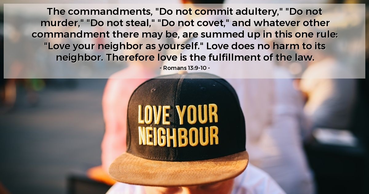 Wouldn’t it be great if we didn’t have to have laws to keep people in line! That’s the point behind Paul’s message here. Treat our neighbors as we would like to be treated. Love them as we want to be loved. If we do that, then we’re not going to do anything that would hurt them, much less violate a command of God’s law that would hurt them.