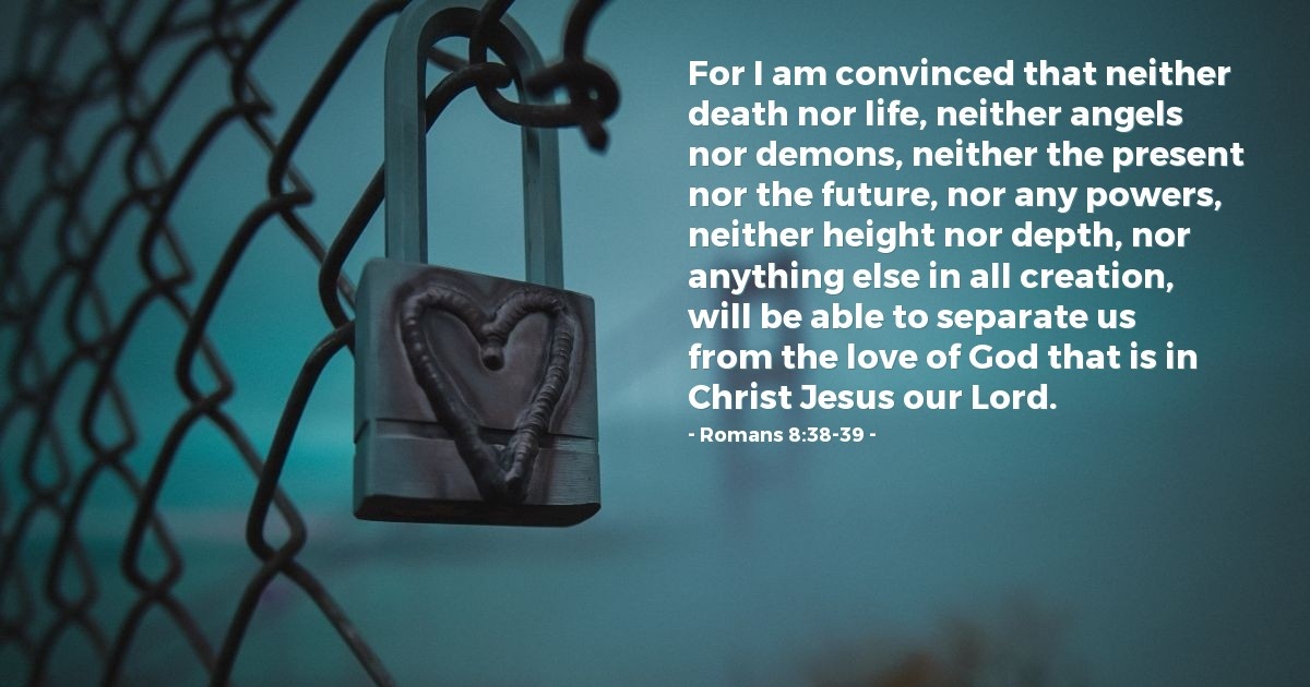 Amen and hallelujah! This passage is incredibly hopeful. Nothing could keep Jesus from coming to save you and me — not the distance between heaven and earth, not the difficulty of an unexpected pregnancy, not a city fully of travelers and parents tired from a long journey, certainly not a maniacal king who sought to snuff out his life, not jeering mobs crying crucify him, not disciples that abandoned him, not soldiers that mocked him, not a whip that raked his flesh, and not a cross that claimed his physical life. So what makes you think God would let you go or give up on you after his love has captured your heart at such a high price to him? Nothing in the created world can separate us from God’s love! Nothing that the evil one throws at us can stop God’s love from holding us fast. The apostle Paul is emphatic: Nothing will be able to separate us from the love of God that is in Christ Jesus our Lord.”